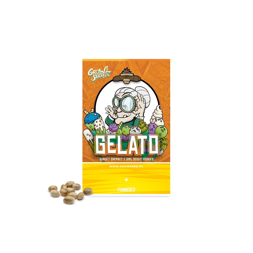 Gelato to feminizowane nasiona marihuany powstałe w wyniku mieszanki genów takich klasyków jak Sunset Sherbet oraz Girl Scout Cookies. Ta odmiana doskonale sprawdzi się w uprawie indoorowej oraz outdoorowej, jej czas kwitnienia to około siedmiu, do dziewięciu tygodni. Osiąga od 80 do 130 cm, a jej wysoka zawartość THC (aż 23%) czyni ją jedną z mocniejszych odmian automatycznych, dostępnych na rynku. Obfituje w plony rzędu 550 do aż 600 gramów na metr kwadratowy. Charakteryzuje się intensywnie zielonymi, puchatymi pąkami, gęsto pokrytymi białymi kryształkami i lepką żywicą. Dominującym terpenem jest kariofilen, przez co w smaku jest raczej ostra (korzenny zapach przypominający mieszankę pieprzu i goździków), ziemista, z dodatkiem delikatnej sosnowej nuty. Prawdziwa gratka dla wprawionych smakoszy — swoim aromatem przekona do siebie osoby poszukujące konkretnych, pikantnych smaków.